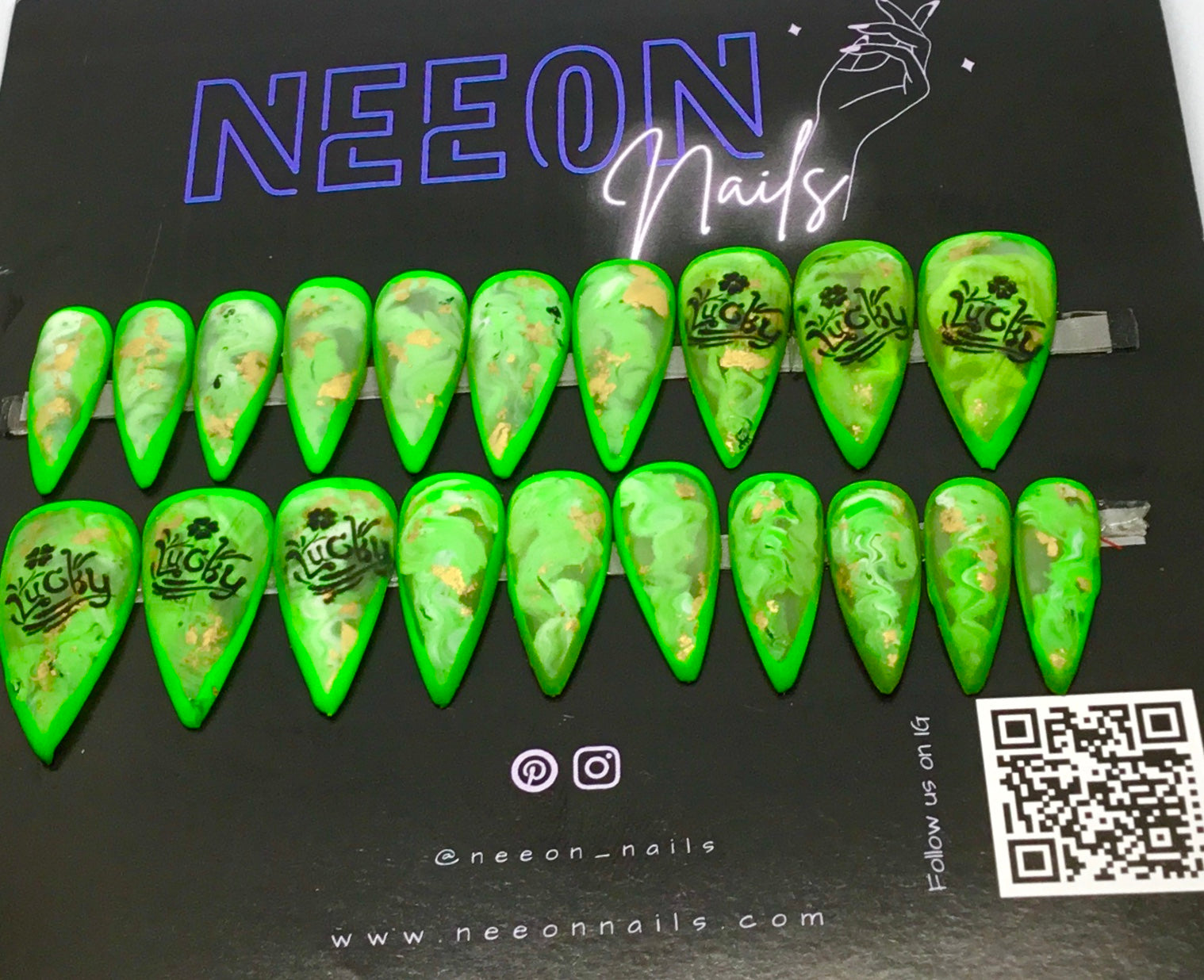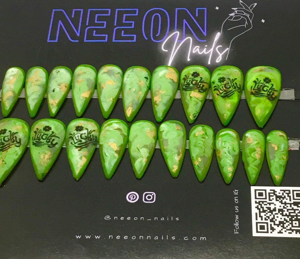 Introduce a blast of glam and color to your next look with Lucky's stiletto fatigue nails! With its unique color-changing effect and golden flakes, you'll feel like a million bucks. Make a fearless statement with these killer nails and prove you're a force to be reckoned with!